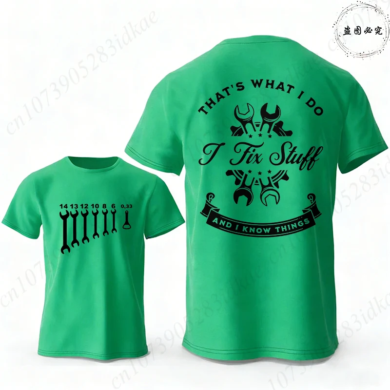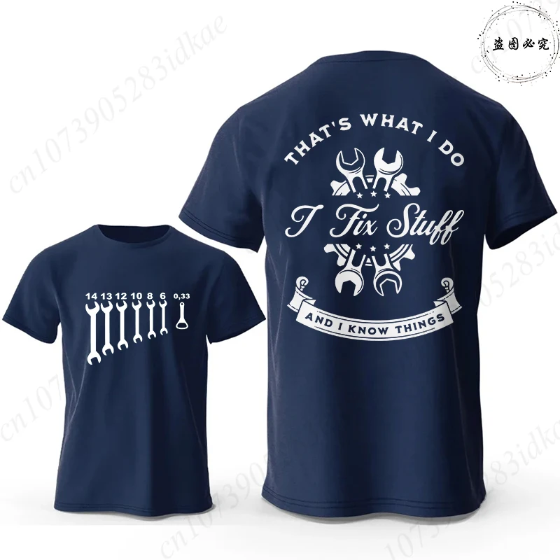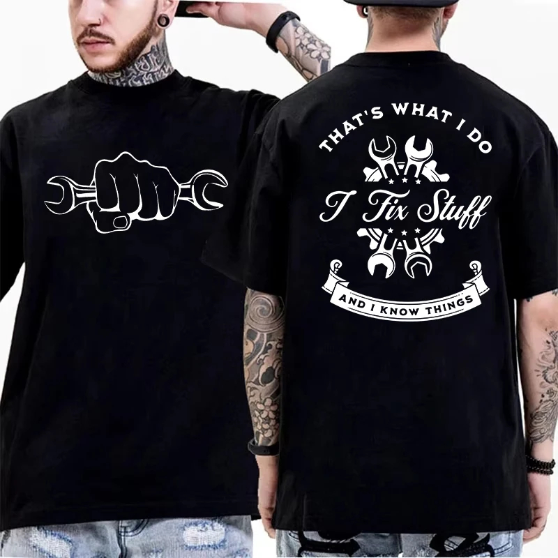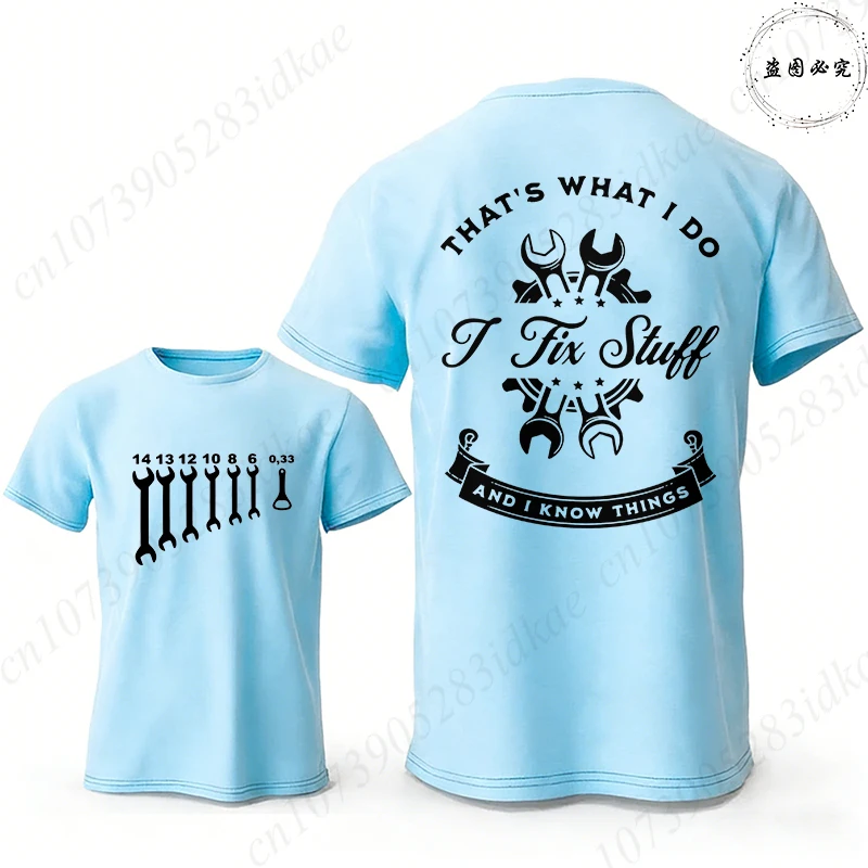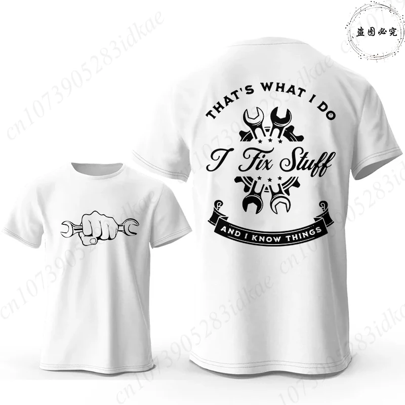 Father's Day Gift T-Shirt, 'I Fix Stuff and I Know Things' Double Sided Graphic Tee, Men's Casual Short Sleeve O Neck Tops